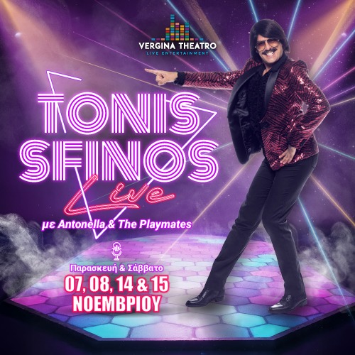 Ο Τόνι Σφηνος, γνωστός performer και παρουσιαστής, με πορεία 14 χρόνων στη διασκέδαση και αμέτρητες συναυλίες σε Ελλάδα και εξωτερικό, έρχεται με την μπάντα του, την Antonella τους Playmates στο Vergina Theatro σε ένα μοναδικό μουσικό πρόγραμμα με παλιές αγαπημένες αλλά και μοντέρνες επιτυχίες.