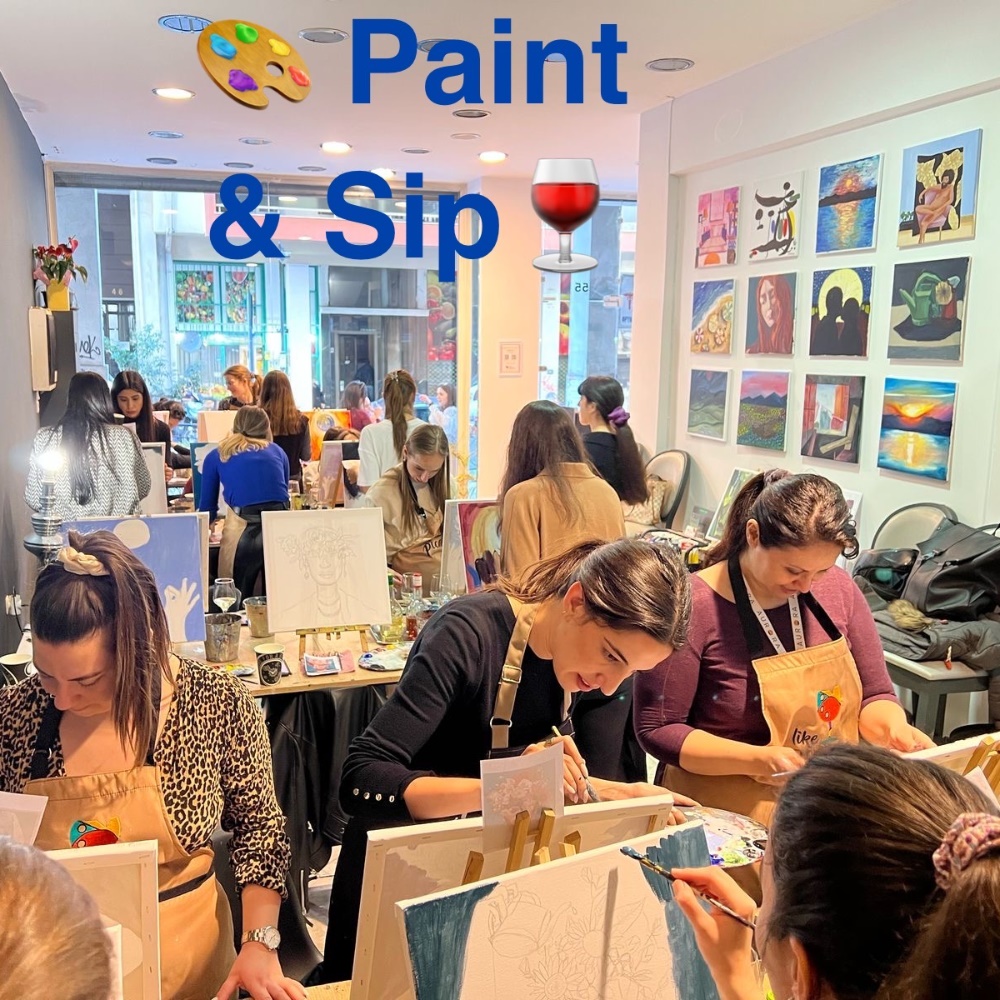 Οι Paint & Sip εκδηλώσεις μας διαρκούν 2μιση ώρες, κατά τις οποίες οι συμμετέχοντες ζωγραφίζουν έργο της αρεσκείας τους υπό την καθοδήγηση καθηγητών των Καλών Τεχνών και με τη συνοδεία κρασιού!