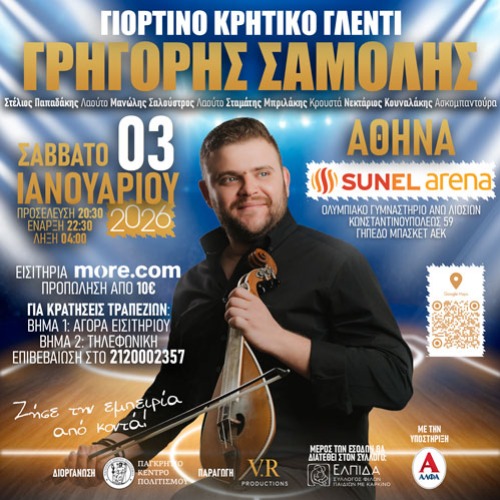 Γρηγόρης Σαμόλης - Γιορτινό Κρητικό γλέντι στην Αθήνα στο Sunel Arena Sunel Arena - Γήπεδο Μπάσκετ ΑΕΚ - Ano Liosia, Attiki